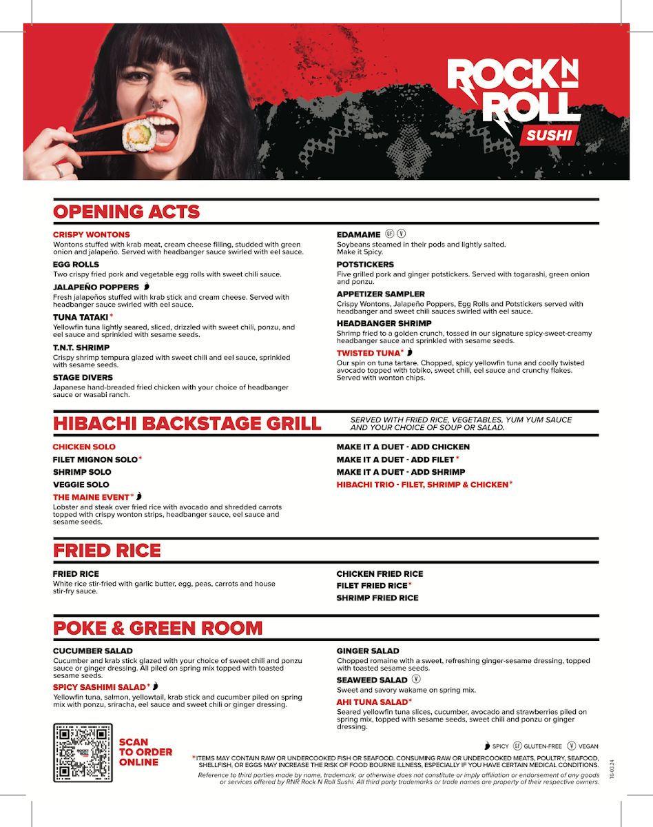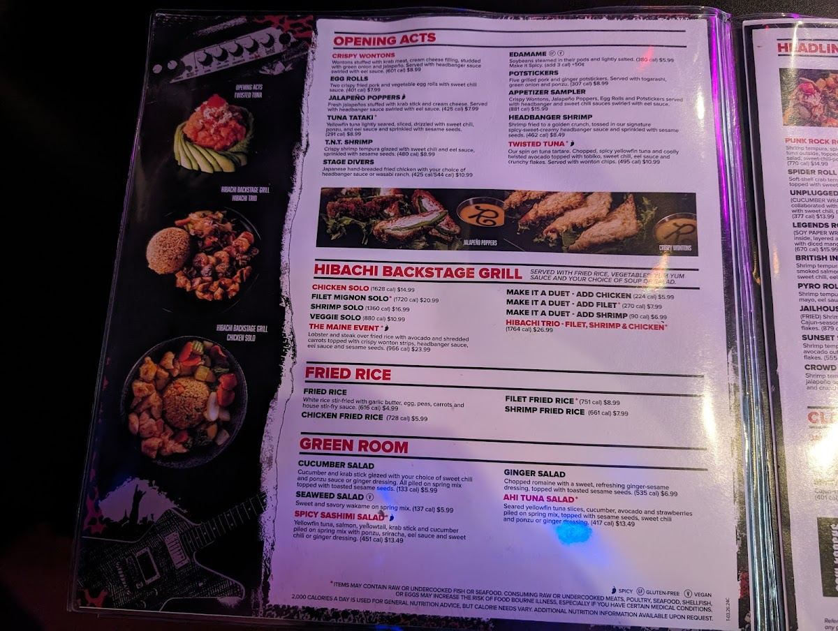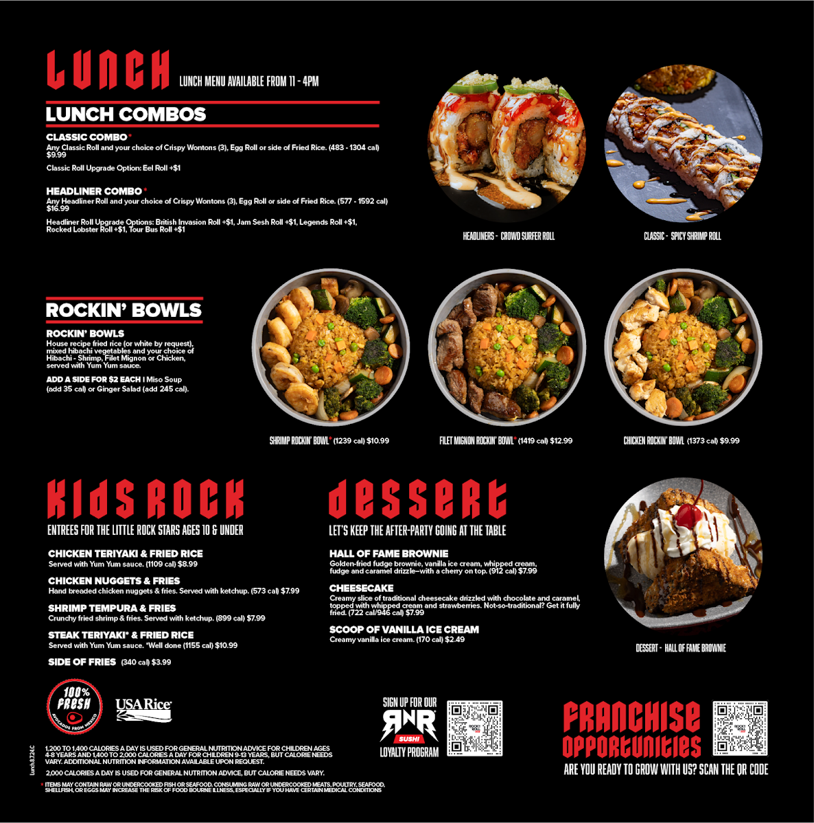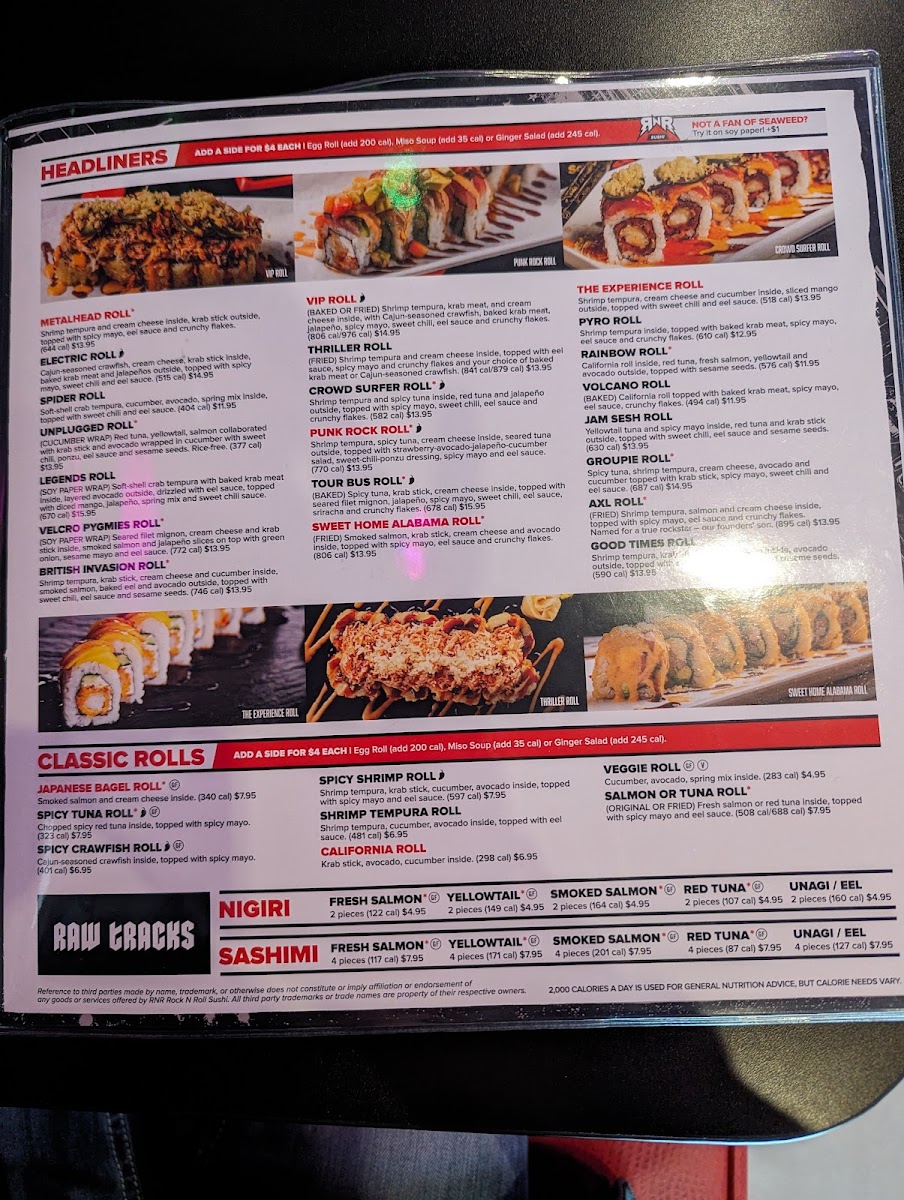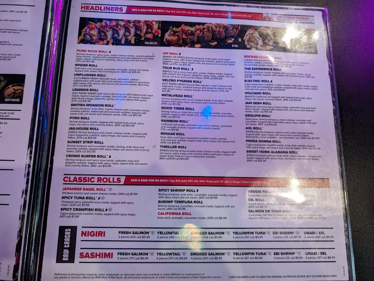The Experience Roll, Punk Rock Roll, Crowd Surfer Roll, Rocked Lobster Roll, Tuna Roll, VIP Roll (Baked)